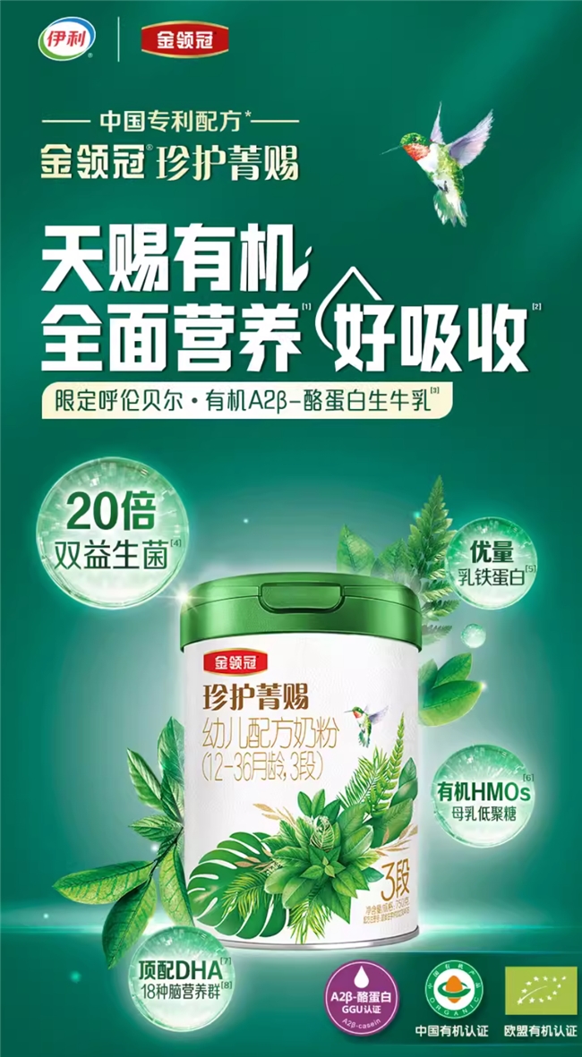 金领冠珍护菁赐3段奶粉主打“天赐有机”,采用限定呼伦贝尔有机牧场的A2β-酪蛋白生牛乳,并获得中国与欧盟双重有机认证。其科学配方涵盖20倍双益生菌、有机HMOs及18种脑发育营养群,并通过GGU权威认证确保A2β-酪蛋白的纯净奶源。临床研究数据显示,该配方有助于提升宝宝肚肚舒适度,显着增强自身保护力,精准满足婴幼儿不同成长阶段的营养需求。